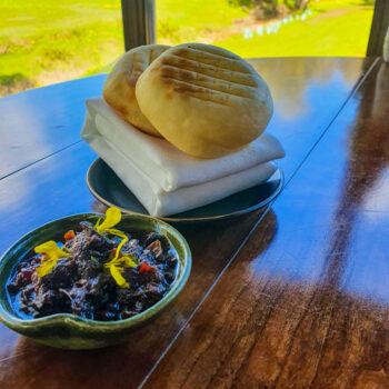 Eggplant, capsicum, sultana dish along with their puffy bread.- I call it puffy, when you open it up and allow the heat to escape, there is just air in the middle! This bread is ever so soft and delicate. I felt like a heathen spreading the wonderfully aromatic eggplant on it…..I then tasted it.