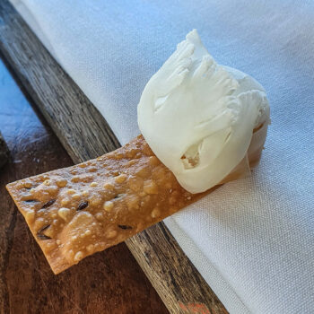 The dish that looks like angel wings folded down on themselves is cauliflower, salmon roe and caraway. The subtleties of this perfectly crafted ball are what taste buds were made to do. Work hard! They’re rewarded with the pop and the warmth of the salty yolk from the salmon roe.