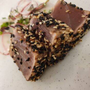 We started with Black Sesame Seared Yellow Fin Tuna, Kohlrabi, Radish, Micro Greens, Citrus Dressing. To say I loved this dish is an understatement! Clean, fresh and that powerful sear!