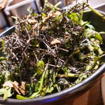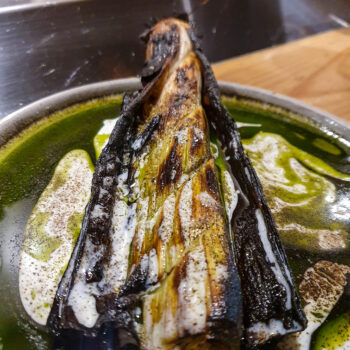 Grilled Leek Buttermilk wakame Let me explain how to eat this. See the ‘burnt’ parts of the leek? I watched friends eat this dish maybe a month ago. While they were praising the dish, they were ignoring the ‘burnt’ parts of the leek. I told them if they include a little in their next mouthful, the flavours of the dish will change and will taste ‘complete’. They did and absolutely loved it.