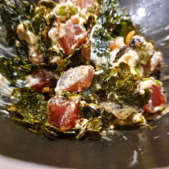 Raw Tuna Edamame Bonito Cream and Grilled Nori. I would never order this dish, one of the reasons I like to let the chef decide what I’m going to eat. This is delicious! The tuna, tender af, the grilled nori adding texture which in turn kept my brain interested. I kept going in for more!